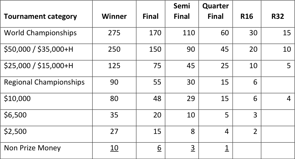 - 国際大会におけるITFポイントは、年間でポイントが上位となる8大会分の合計となる。