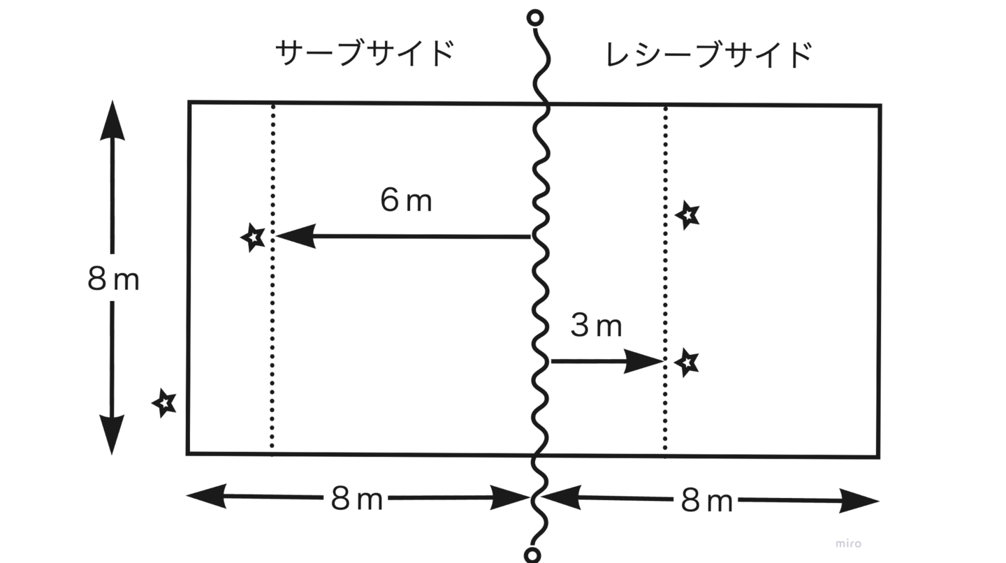 コートはビーチバレーと同じ広さ。横が8m、縦が16m(片側は8×8の正方形)。